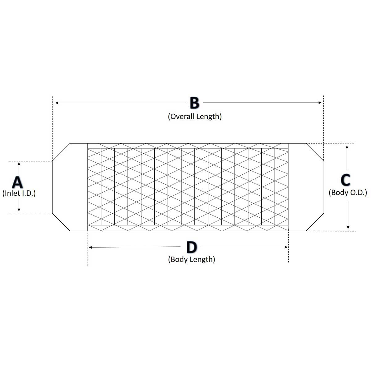 | Inlet I.D. (A) | Overall Length (B) | Body O.D. (C) (mm) | Body Length (D) (mm) | ||